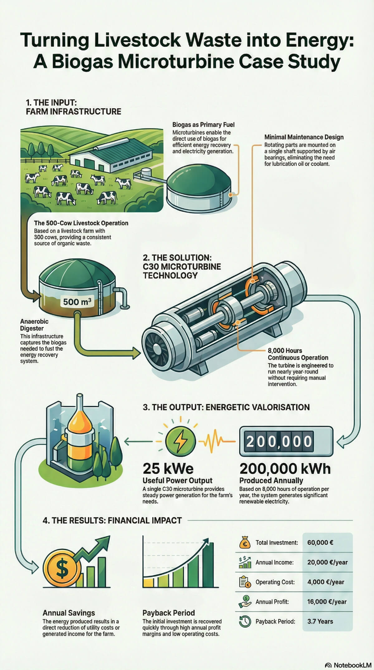 A case study on the energetic valorisation of biogas using microturbines, specifically within the context of a livestock operation. It explains that these machines convert organic gas into power using a single-shaft design with air bearings, a mechanical setup that eliminates the need for traditional lubricants or coolants and allows for minimal maintenance. By applying this technology to a farm with 500 cows, the study demonstrates how a single unit can generate 200,000 kWh of energy annually while operating almost continuously. Ultimately, the study serves as a financial and technical pitch, highlighting a payback period of 3.7 years and a significant reduction in yearly overheads for agricultural businesses.