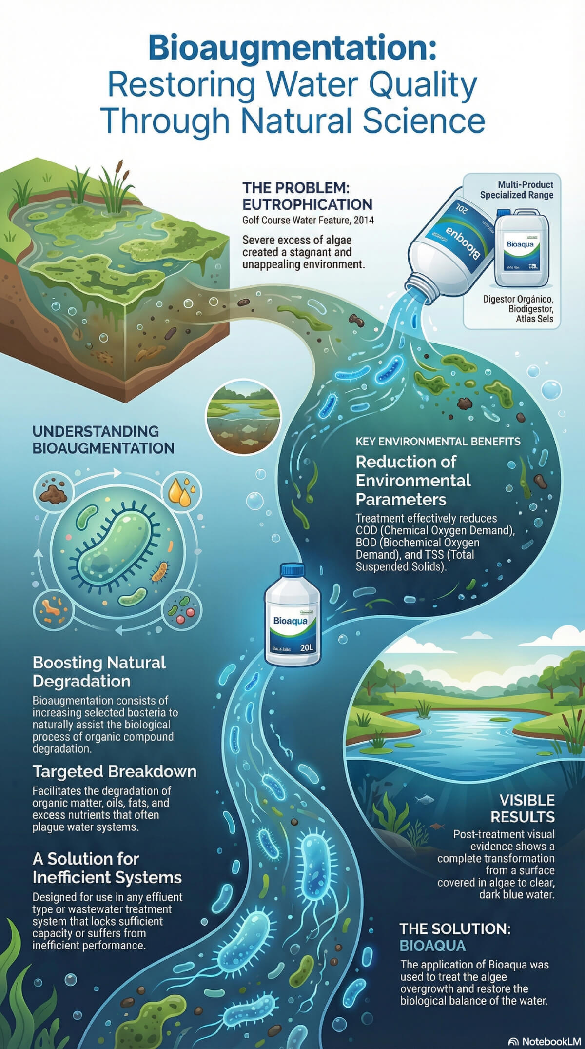 This study presents an overview of bioaugmentation, a specialised water treatment method that uses targeted bacterial cultures to enhance the natural breakdown of organic pollutants. By introducing these microorganisms into struggling wastewater systems, the technology efficiently lowers levels of harmful environmental contaminants, fats, and surplus nutrients. A practical application is highlighted through a golf course case study, where the product Bioaqua was successfully utilised to combat eutrophication caused by overabundant algae. Ultimately, the source illustrates how this biological approach serves as a sustainable solution for restoring water clarity and ecological balance in compromised aquatic environments.