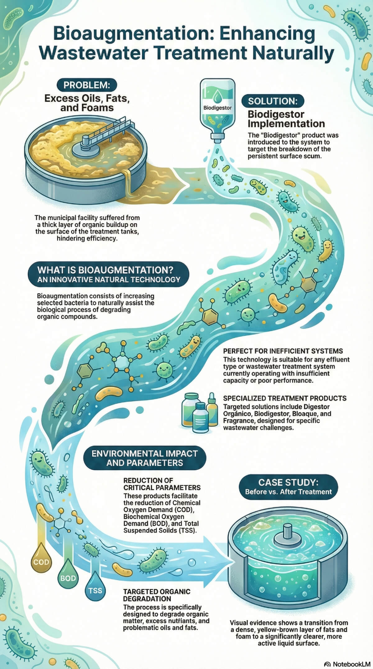 This study introduces bioaugmentation, an advanced wastewater treatment method that involves adding specifically chosen bacteria to enhance the natural breakdown of organic pollutants. It targets facilities struggling with low capacity or poor efficiency, offering a way to lower critical environmental indicators such as chemical and biological oxygen demand. By utilizing specialized products like the "Biodigestor," the system effectively tackles difficult waste materials, including oils, fats, and thick foams. A practical case study within a municipal setting demonstrates how this biological intervention transforms contaminated effluents into cleaner water by restoring the system's processing power.