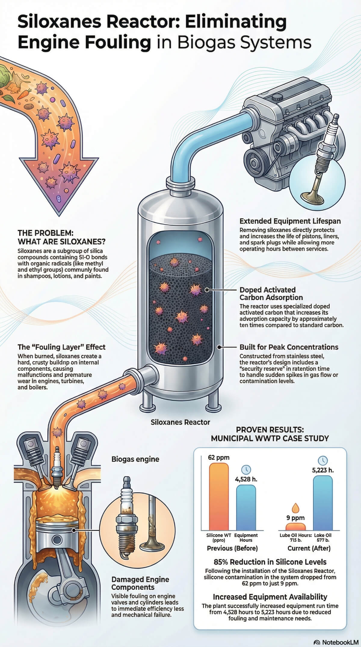 A case study from a municipal wastewater treatment plant regarding the management of siloxanes, which are silica-based organic compounds found in consumer goods that contaminate biogas systems. These substances are problematic because they create a harmful fouling layer on machinery, leading to the rapid deterioration of essential engine components like spark plugs and pistons. To combat this, the text introduces a stainless steel reactor that utilises doped activated carbon to adsorb these impurities with high efficiency. The data confirms that implementing this reactor significantly lowers silicone concentrations in lubricant oil, thereby extending the operational lifespan and maintenance intervals of the power generation equipment.