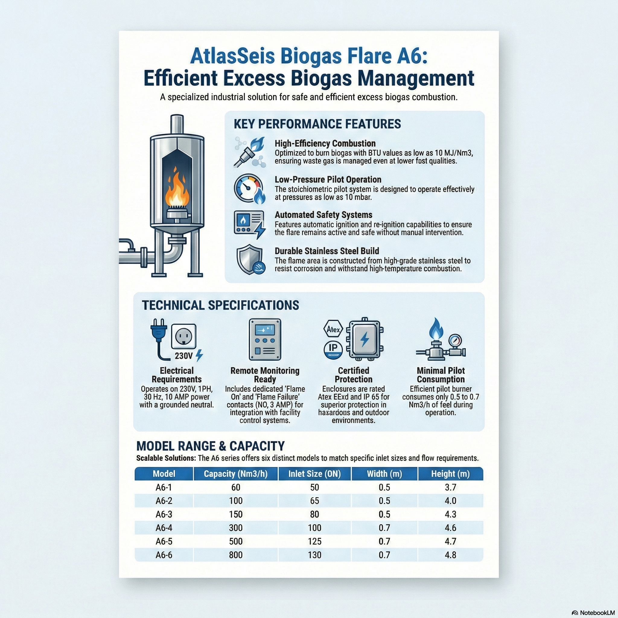The BIOGAS FLARE A6 is a specialized combustion unit designed to burn the excess biogas produced by digesters. It ensures that surplus gas is disposed of safely and efficiently, managing the output of biogas systems effectively.