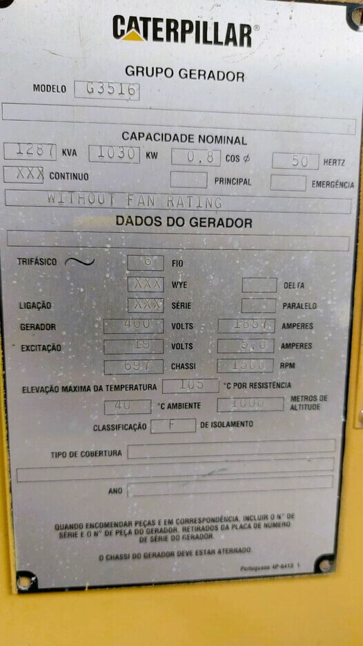 GAS69524 – 1030 kW Complete Natural Gas power plant 1030 KW based on a CATERPILLAR G3516 gensets with 1030 Frequency: 50Hz – Voltage: 400 V – Operating Hours 87,360 – Major overhaul done by authorized CAT dealer at 85,000 working hours. Full maintenance performed by an authorized CAT dealer. – Year: 2000