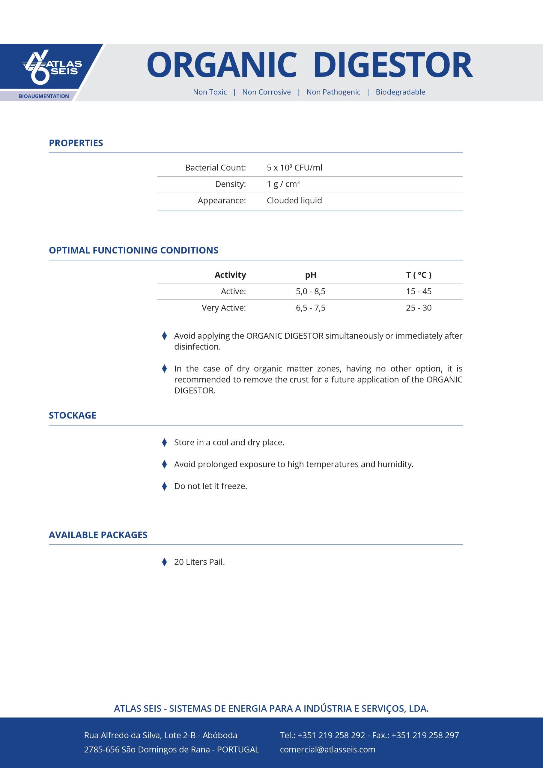 The ORGANIC DIGESTOR is a powerful microbiological product designed specifically for bioaugmentation and the treatment of livestock manure. Composed of a selected mixture of bacteria, it functions by liquefying and degrading organic wastes found in manure pits, lagoons, sewers, and residual wastewaters that contain excessive organic matter.